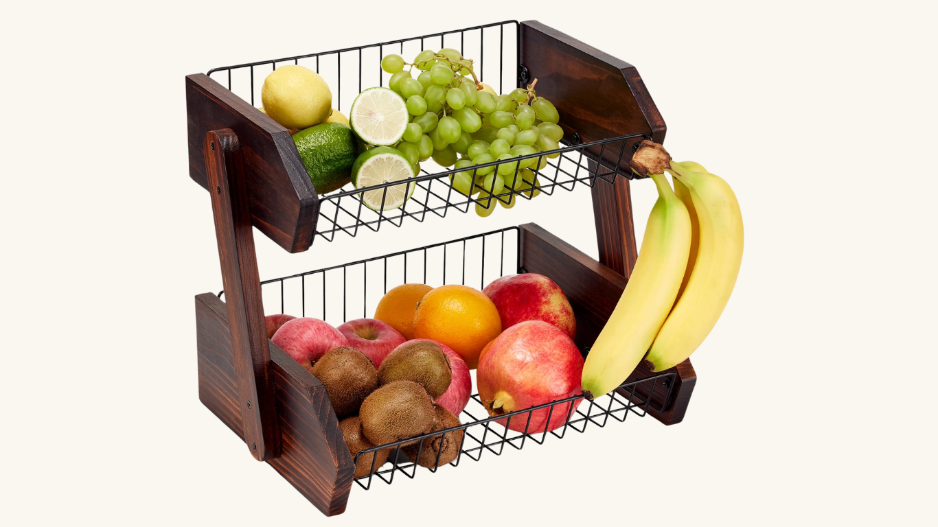 If you’re looking for a stylish and durable fruit basket to organize your kitchen counter, the NANAGIFTREE 2 Tier Fruit Vegetables Basket with 2 Banana Hangers is a great choice.