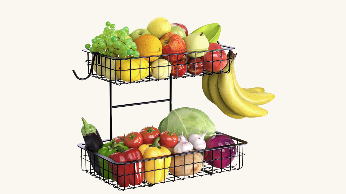 - The 2-tier design allows you to store a variety of fruits, vegetables, and bread of different sizes, while the 2 banana hooks provide a perfect storage solution.