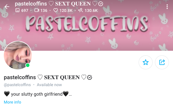 Pastel Coffin is a goth babe with giant tits and 120,800 likes on OnlyFans. She offers a sexting service for $15 per month and has 697 photos and videos on her page.