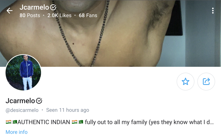 Jcarmelo is an authentic Indian gay only fans up-and-coming star who loves interacting with his fans. Adding weekly content with plenty of fuck videos, he wants to hear your deepest, darkest fantasies and bring them to life, not just for you, but for all his fans.