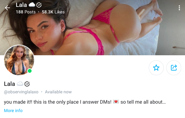 Lala is a gorgeous, petite teen with long, dark hair and a slender, athletic frame. Her feed is filled with explicit poses and raunchy come-hither looks. Lala posts everything from booty-shaking routines to seductive selfies in her luscious lingerie. Lala has a total of 58,300 likes on OnlyFans, and her media includes 192 photos and videos. Her OnlyFans account costs $9.99 per month.