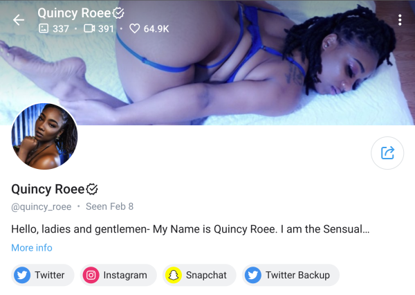 Quincy Roee is a highly specialized ebony Onlyfans model with nearly 65,000 likes, over 300 photos, and over 300 videos. She is known for her oral skills and is often referred to as the gloryhole princess. Quincy is enthusiastic about adding freaky twists to sensual encounters and knows how to drain your balls. She has two heaping handfuls of derriere and some eye-popping teardrop breasts. You can follow Quincy Roee on Onlyfans, Instagram, Twitter, and Snapchat.