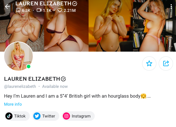Lauren Elizabeth is a stunner from France with a massive following of 2.21 million likes on her OnlyFans page. Her content includes access to sultry photosets, videos, and live streams that are sure to keep you interested for hours on end.