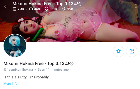 With over 840,000 likes and 95,000 fans on OnlyFans, Mikomi Hokina is a popular choice for those looking for a German goth cosplay model. Mikomi takes cosplay to the next level, allowing your imagination to finally take a rest. She provides all your adult cosplay needs and is a must-see for those looking for a unique goth girl on OnlyFans.