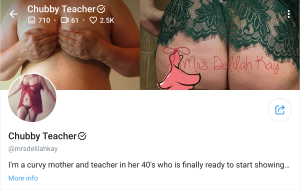 Chubby Teacher, aka Miss Delilah Kay, is a real teacher who shares topless and fully nude pics and vids on her page. She has 2.5K likes and 750+ media files on her page. Her subscription fee is $18 per month.