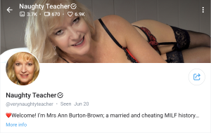 Naughty Teacher, aka Mrs. Ann Burton-Brown, is a history teacher in her 60s who is married but cheating on her husband and posting it all over the internet. She has 6.9K likes and 4.3K media files on her page. Her page is free to subscribe to.